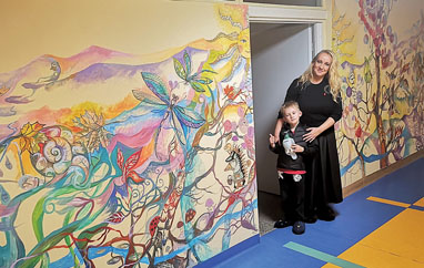 S. Juškevičiūtė su sūnumi Arnu prie ištapytų sanatorijos Saulutė sienų