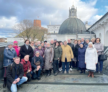 Druskininkietis kun. Virginijus Česnulevičius, Arkikatedros administratorius, jau laukė mūsų atvykstančių. Vedžiojo po Švento Vladislovo, Stanislovo, Kazimiero, Valavičių, Goštautų (Sapiegų Madonos) koplyčias. Daug dėmesio skyrė Lietuvos globėjui. Iki mūsų laikų sklinda pasakojimai apie 1518 metų Polocko apgynimą nuo rusų antpuolių ir kitus Šv. Kazimiero stebuklus. Kai karalaičio pasigesdavo rūmuose, tarnai jį užtikdavo naktį besimeldžiantį prie uždarų Katedros durų. Rūstus ir jo gyvenimo moto: Mirsiu, bet nenusidėsiu. Dėl to mene vaizduojamas su lelija tyrumo, šviesos, begalinio atsidavimo Dievui simboliu. Tremtinių koplyčioje išvydome šiuos arkivyskupus: akademiką, prelatą M.Reinį, 1953 m. mirusį Vladimiro kalėjime, ir Vilniaus ordinarą J.Steponavičių. Visų dėmesį prikaustė Sibiro Madona, prie kurios 2018 m. rugsėjo 22-ąją meldėsi popiežius Pranciškus. Krasnojarsko krašte, Manos rajone, Korbiko gyvenvietės kapinėse iškilo Dievo Motinos statula. Kas jos autorius? Tai Linkuvos gimnazistas, pokario metais iliustravęs pogrindinį laikraštėlį Nepavergtos mintys. Už tokį baisų nusikaltimą teistas 10 metų lagerio ir 8-erius tremties. 1955 m. paleistas iš lagerio, iškeliavo į tremtį pas tėvus, apgyvendintus Korbike. Ten iš galingos pušies išdrožė Švč. Mergelei Marijai paminklą, prie kurio melsdavosi lietuviai, kitų tautybių žmonės. Įdomu, kad statulą pašventino iš Krasnojarsko atvykęs Juozas Gustas, paskutinis Salomėjos Nėries, prieš ją išvežant į Kremliaus ligoninę, nuodėmklausys. Kai Korbiko Madoną parvežė į Lietuvą, vidus buvo taip išpuvęs, jog prireikė 4 metų ją restauruoti. Skulptorius A.Salys išdrožė Švč. Mergelės Marijos kopiją. Ji buvo pastatyta Korbiko kapinėse. Viena iš supažindinimo su Katedra įsimintinų akimirkų tai pasikėlimas liftu ir pasivaikščiojimas po stogą. Taip arti išvydome didingą Šv.Stanislovo skulptūrą, iš aukštybių pasigėrėjome ir senamiesčio panorama.