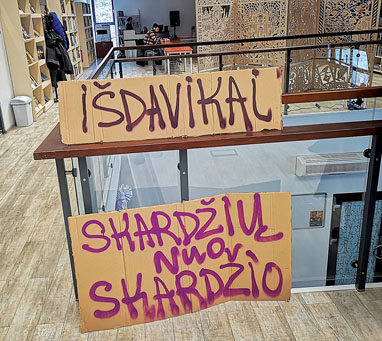 Prie Druskininkų viešosios bibliotekos įėjimo protestuotojų laikoma juosta su užrašu Konstitucija buvo aušriečių perplėšta įeinant į biblioteką, o treninguotas Nemuno aušros gerbėjas juostą sviedė į protestuotoją, apsigobusį Ukrainos vėliava, ir nusikeikė necenzūriniais žodžiais: chohole tu job**as.