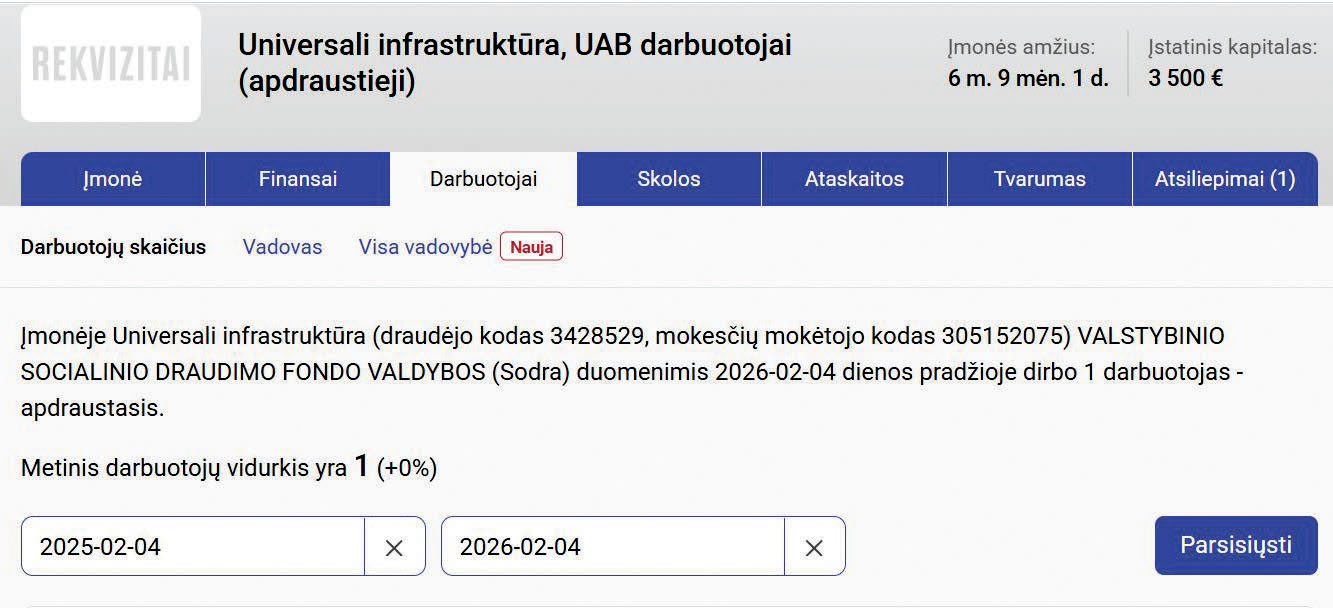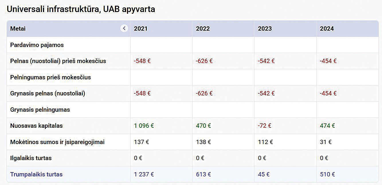 https://rekvizitai.vz.lt/imone/konferenciju_infrastruktura/. Šio portalo duomenimis naujojo Druskininkų kultūros centro nuomos konkursą laimėjusi UAB Universali infrastruktūra turi vieną darbuotoją, 2024 metus baigė su 454 eurų nuostoliu. Pagal šios bendrovės registracijos adresą Vilniuje ir duomenis viešojoje erdvėje, matyti, jog ši UAB priklauso sporto ir kultūros infrastruktūros objektų valdymu užsiimančiai įmonių grupei UAB Infrastruktūra LT. Šios grupės dukterinės bendrovės valdo ne vieną pramogų objektą Lietuvoje: Palangos koncertų salę, Švyturio areną, Klaipėdos baseiną, Girstučio sporto kompleksą.
