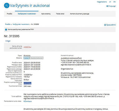 Lapkričio 21 d. savivaldybės tarybos posėdyje priėmus sprendimą, davusį žalią šviesą naujųjų kultūros rūmų nuomos konkursui, Druskininkų valdžia elektroninių varžytynių ir aukcionų portale evaržytynes.lt paskelbė kultūros centro nuomos konkursą. Druskininkų savivaldybė 20 metų terminui išnuomoja statomus Druskininkų kultūros ir kongresų rūmus.Turtą charakterizuojantys duomenys: paskirtis: kultūros; aukštų skaičius: 3; bendras plotas 8 228,72 kv. m; Patalpos objekte: Didžioji salė - 1175 vietų; Mažoji salė - 513 vietų; Kino salė: 151 vietos; taip pat erdvės parodoms ir kt. Pagal su rangovu 2025 m. liepos 16 d. sudarytą Statybos darbų sutartį Nr. 26-479, visi statybiniai darbai turi būti užbaigti ir 100 proc. Kultūros centro užbaigimas įregistruotas Nekilnojamojo turto registre 2026 m. lapkričio mėn. Esamas registruotas baigtumas - 70 proc., nurodyta Druskininkų valdžios skelbime. Registracijai buvo duotos dvi dienos sausio 19-20 d. Debesies pretendentų į nuomininkus naujasis Druskininkų valdžios pasididžiavimas, matosi, nesulaukė. Nuomos konkursas paskelbtas įvykusiu, tačiau, panašu, kad jame dalyvavo tik viena bendrovė. Kaip matyti iš viešos informacijos minėtame aukcionų portale, Druskininkų savivaldybės paskelbta pradinė nuomos kaina per mėnesį 4 tūkst. 613 eur be PVM, tepakilo 7-iais eurais - iki 4 tūkst. 620 eur.