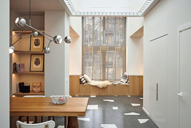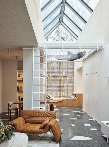 Išskirtinio dėmesio šiame projekte nusipelno per du aukštus suformuotas apartamentas, įrengtas po originaliai pastate buvusiu stikliniu dvišlaičiu stogu. Tai buvo esminė erdvė, kurią būtinai turėjome ir išlaikyti, ir integruoti į interjerą. Pro šį stoglangį į didžiausio apartamento svetainę patenka labai daug šviesos ir saulėtą dieną ji kardinaliai keičia erdvę: per stogą nuolatos, tik vis kitaip krintanti šviesa ir šešėliai kaskart sukuria kitokią atmosferą, apie ypatingą architektūrinį interjero elementą kalbėjo A. Raudonikis.