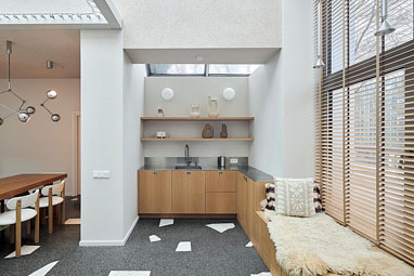 Tai puikiai įrodo virtuvės zonos funkcinis sprendimas. Virtuvė įrengta labai nestandartinėje erdvėje, kurios dalį užima žema palangė, ant kurios galima prisėsti ar atsigulti ir stebėti vaizdą per didelį langą.